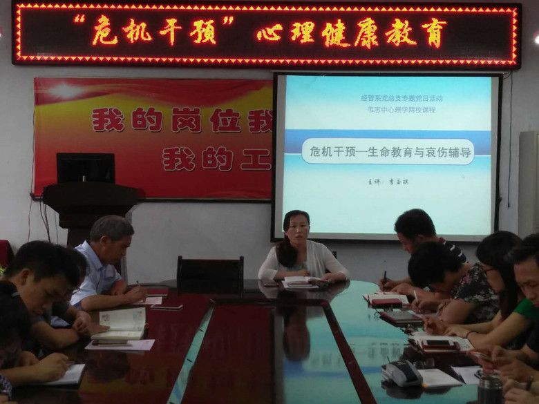 为了更好地学习贯彻十九大精神和深刻领会习近平新时代中国特色社会主义思想。经管系党总支教工支部和员工支部于6月8日开展了主题党日活动,此次党日活动以“危机干预”心理健康教育专题讲座的形式开展,由李玉琪副经理主持。