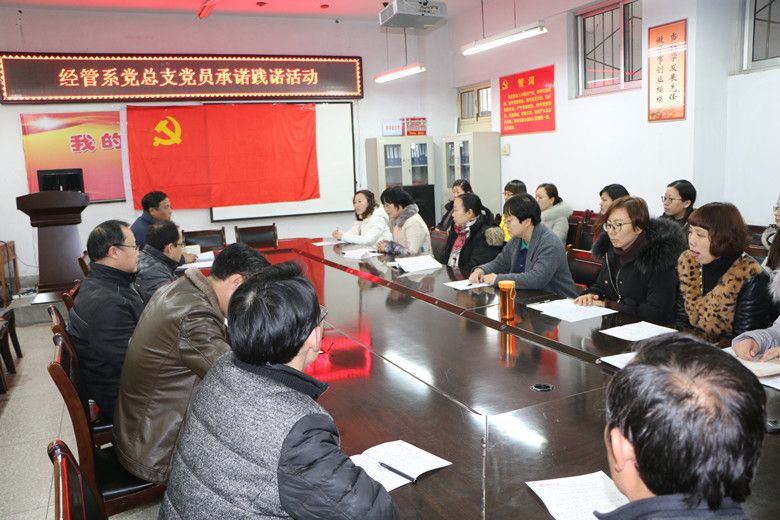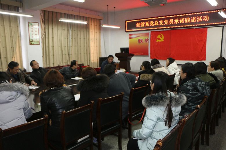 为深入贯彻党的十九大精神,推进 “两学一做”学习教育常态化制度化,强化全行党员的身份意识和担当精神,2017年12月28日,经管系党总支开展 “争创一流业绩,争做优秀党员”为主要内容的党员承诺践诺活动。要求全体党员将党员身份“亮”出来,工作业绩“干”起来,关键时刻“站”出来,先锋形象“树”起来,实行公开承诺,切实体现党员的先进性,推动“两学一做”学习教育向纵深发展。