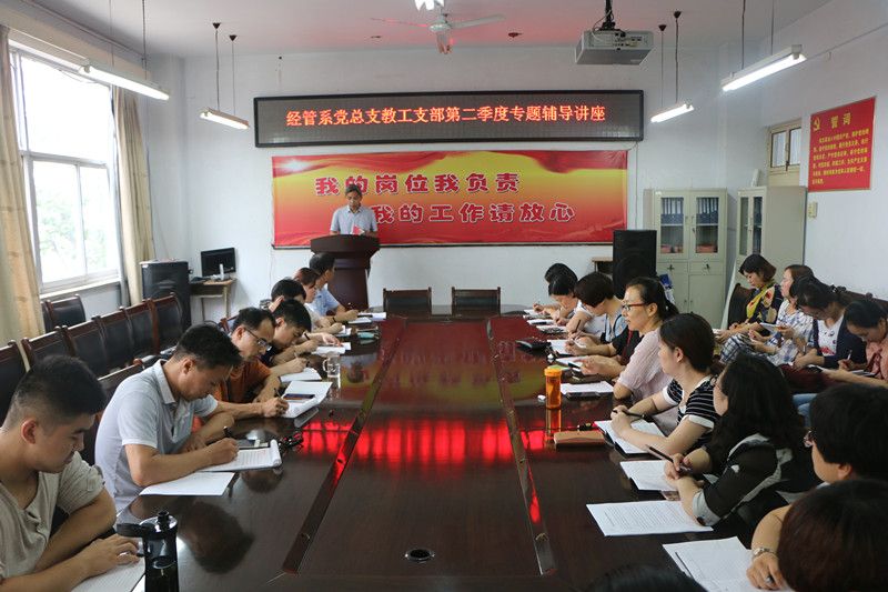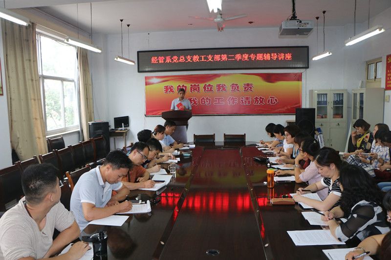 2017年6月19日下午三点,经管学院经理卢国红同志以“学习《关于新形势下党内政治生活的若干准则》”为题,在会议室为全体党员进行了专题辅导。