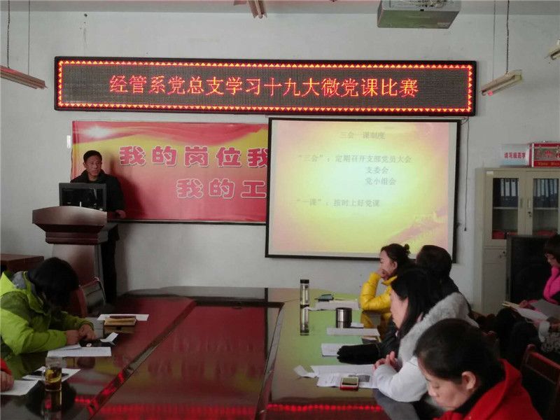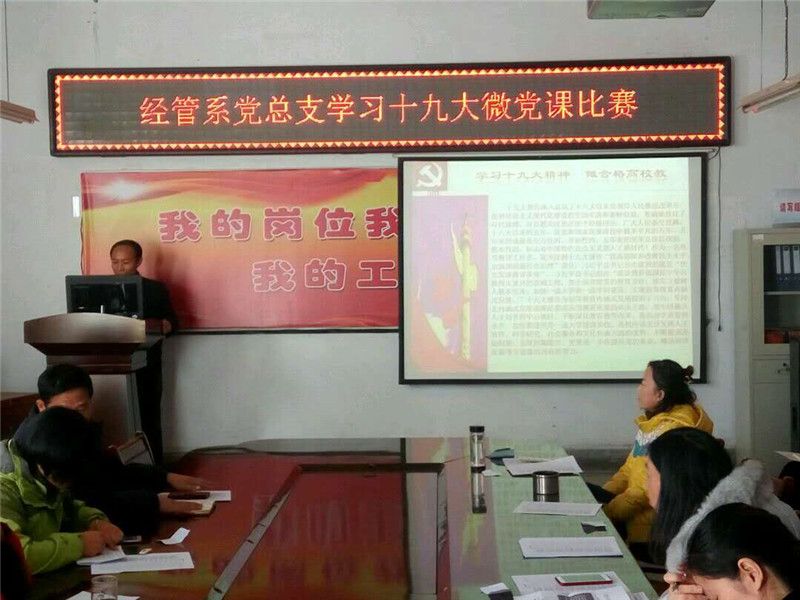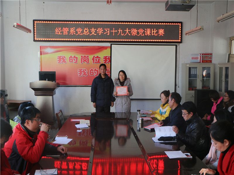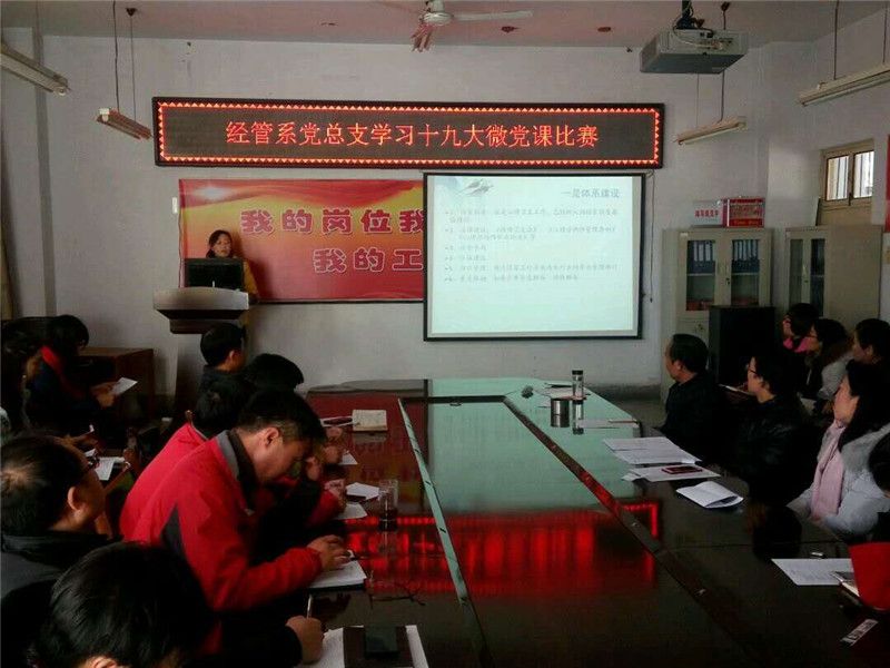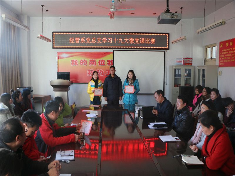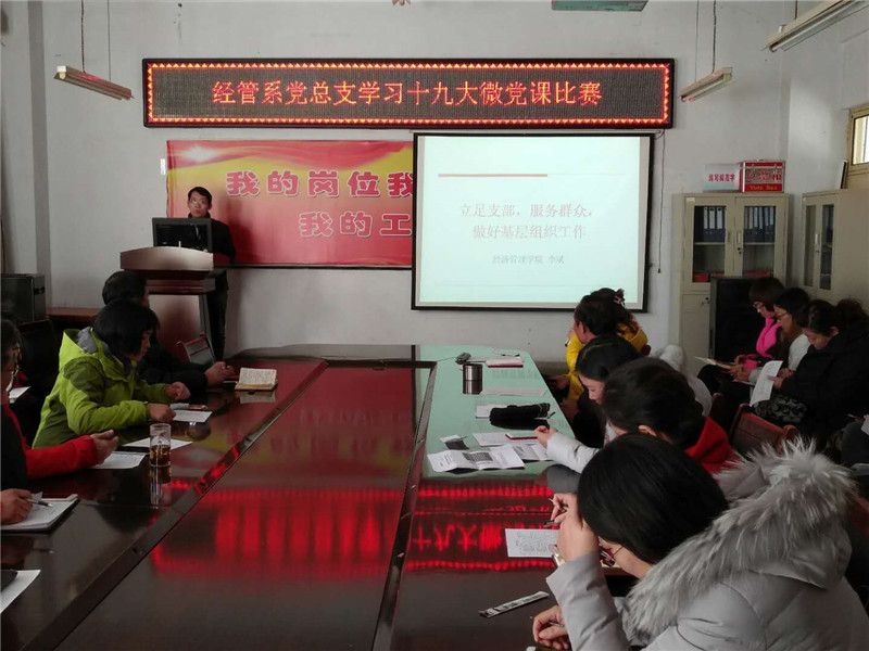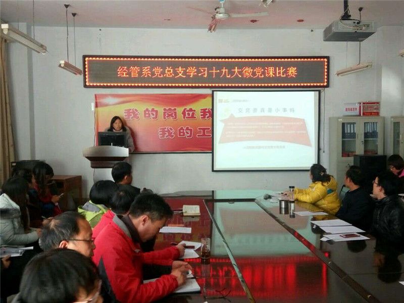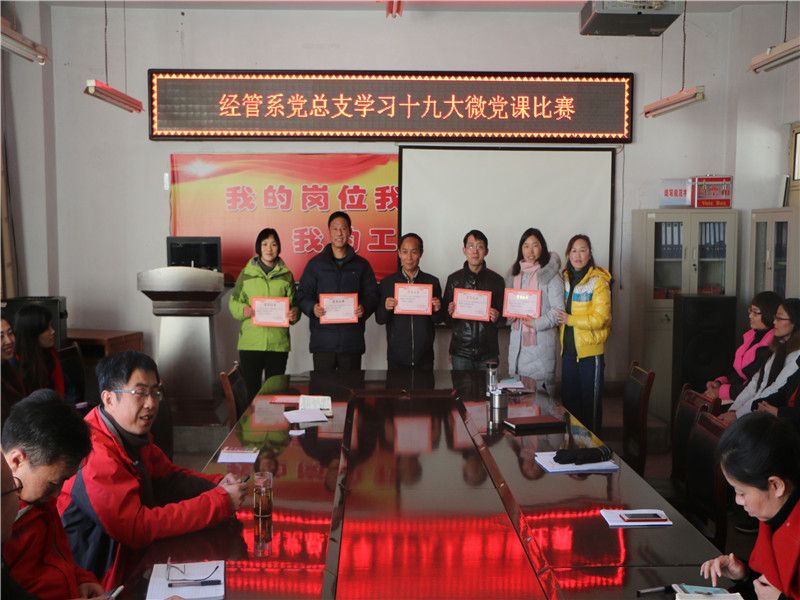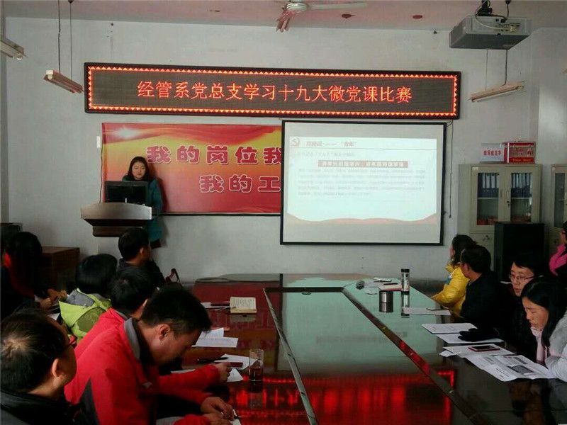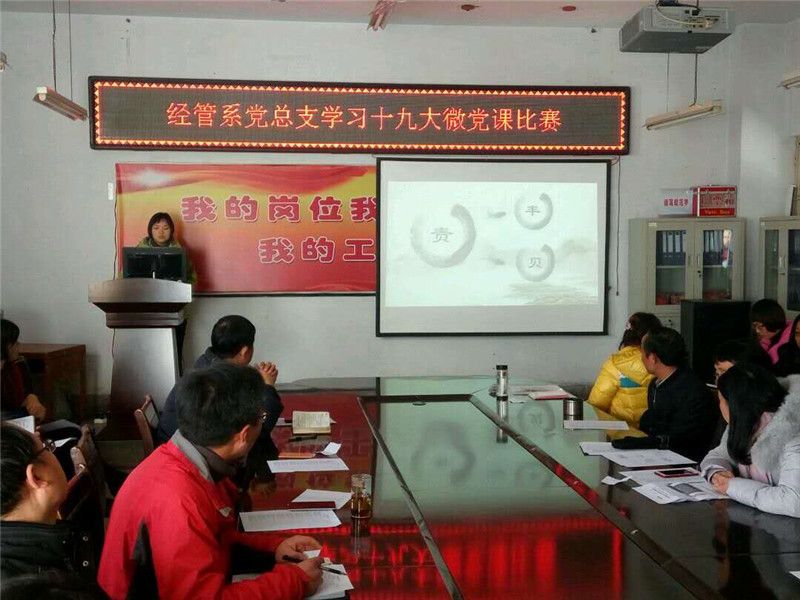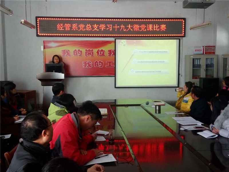 2017年12月08日下午,经管系党总支在院会议室举行了“学习十九大微党课比赛”。此次“微党课”活动,旨在以“党课”为载体,创新党员学习十九大精神模式,不断提升党支部开展党员教育的能力,增强组织生活的吸引力。