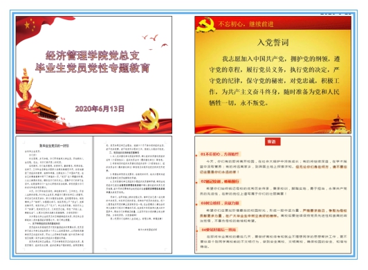 会上,首先由员工党支部组织委员司文杰带领全体毕业生党员重温入党誓词。其次司文杰老师下发了《致2020届毕业生党员的一封信》,就毕业生组织关系转接工作进行了详细讲解。她依照《党章》中有关组织关系转接的内容带领党员重温了有关要求,强调:充分认识党组织关系转接工作的作用和重要性;了解开展党组织关系转接工作的意义和价值;阐明了组织关系转接的原则。之后又重点介绍了办理2020届毕业生党组织关系转接工作的程序和规范,阐述了党组织关系转接中需要注意的问题,并对支部今年毕业生组织关系转接工作进行了具体安排。以确保今年毕业生组织关系转接工作能顺利完成。会议最后,司文杰老师代表经管公司党总支向全体毕业生党员送出寄语: