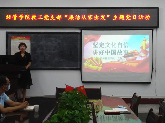 本次党日活动主题为“廉洁从家出发,弘扬廉洁家风”,活动分为四个部分进行,一是加强学习,树立廉洁家风。经管学院教工党支部将习总书记对廉洁家风的重要论述、党内法规关于家风之规定摘编成册,发放给支部党员学习,并现场观看《树廉洁家风,创幸福家庭》公益沙画视频;二是坚定文化自信,讲好中国故事。由卢静同志讲述“两弹一星”奖章获得者郭永怀及夫人李佩的廉洁故事,传承廉洁家风;三是现场发放了《征集卡》,向支部党员征集家风家训和廉情寄语;四是组织党员签订《廉洁从家出发•家风建设承诺书》,我们倡议每位党员做如下承诺:勤俭持家、孝敬父母、管好配偶、关教子女、严己修身。
