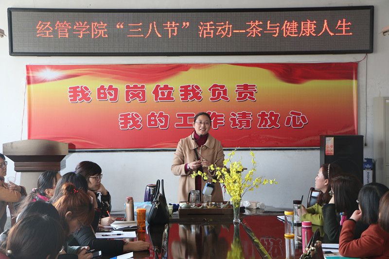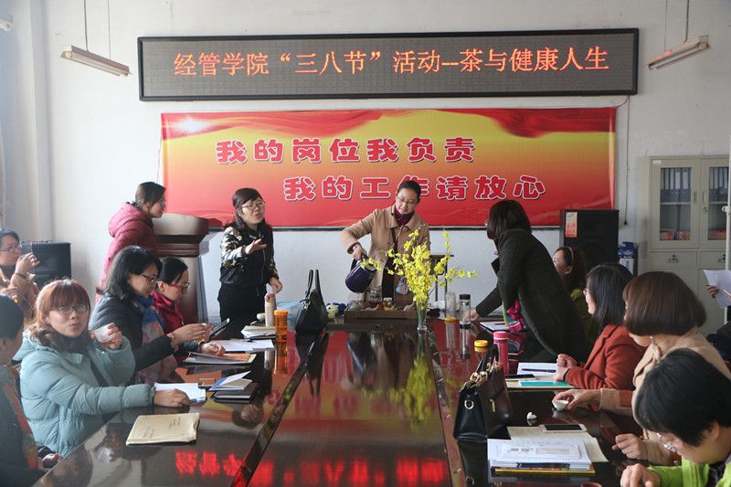 2017年3月6日下午,在“三八妇女节”来临之际,为营造出健康、和谐、积极向上的节日氛围,增进经管学院女教工之间的交流,进一步提升女教工爱岗敬业、乐于奉献的工作热情,经管学院在学院会议室开展了以“茶与健康人生”为主题的讲座活动。讲座由王晓艳老师主讲,并进行了现场的茶道演示,讲解了茶与健康人生的之间关系,一杯清茶,一种人生,豁达,开怀!细细品味,苦中有甜,清香四溢,健康人生的真缔!大家闻着淡淡地茶香,没有一点矫饰和浮躁,忘却了一切得失和荣辱,只有一份恬淡的心境。