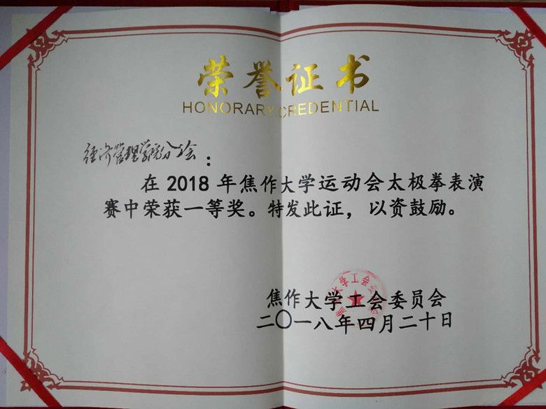 在比赛中,经管学院代表队第11个出场,别出心裁的队形设计,井然有序的太极动作展示,在抑扬顿挫的音乐伴奏下运行自如,参赛队员们将太极拳刚柔相济的独特魅力展现得淋漓尽致,体现了经管学院超高的实力和精湛的水平。经过经管学院全体队员的努力,在此次运动会的太极拳表演赛中,获得了第一名的佳绩!