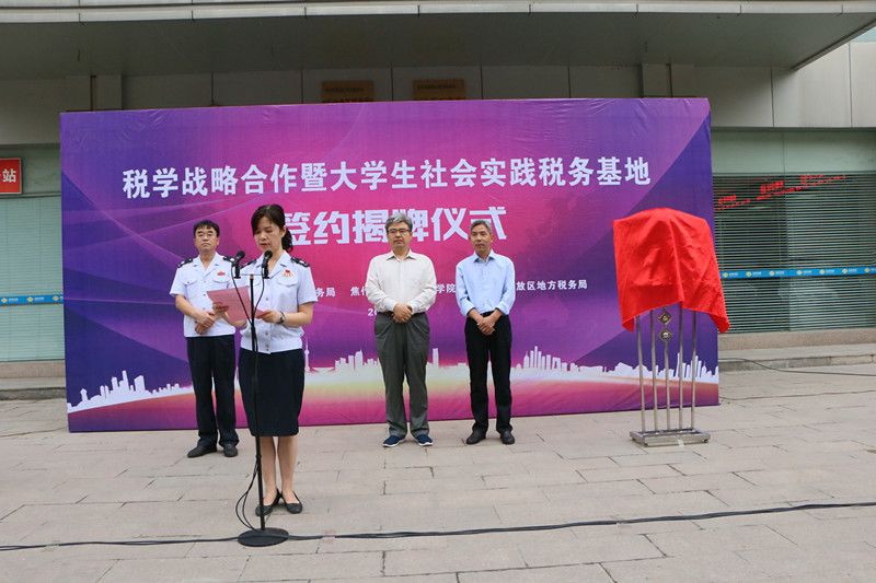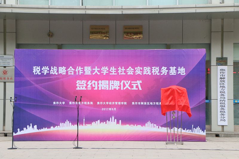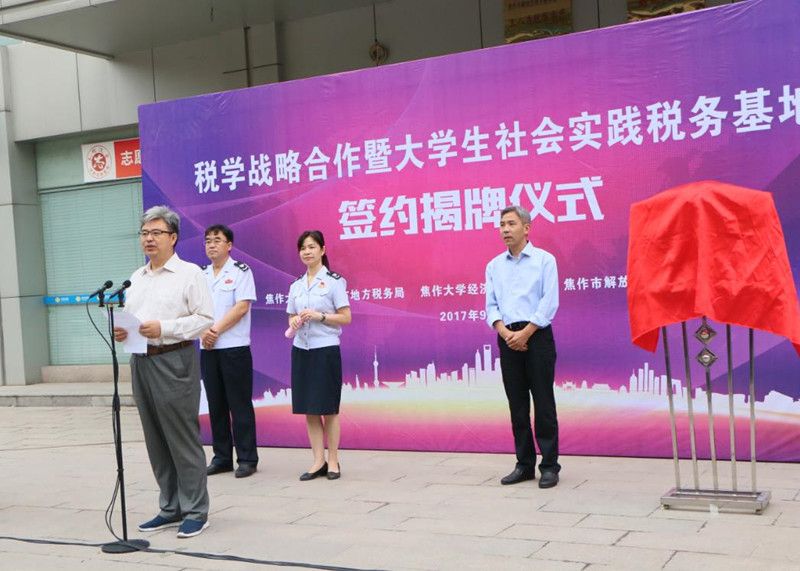 2017年9月29日上午,bw必威西汉姆联与焦作市地税局在解放区地方税务局纳税服务税务分局举行了税学战略合作暨老员工社会实践税务基地签约揭牌仪式。