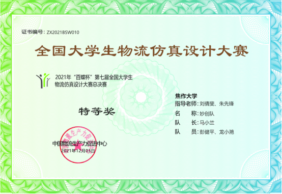 整个比赛设本科组和高职组两个赛道,有选拔赛和总决赛两个赛程,河南省的选拔赛由河南省物流协会主办,已成功举办八届。本届比赛高职组全省有36所院校共63支队伍参赛,由刘倩斐、朱先锋老师指导的马小兰、彭健平、黎晓斐组成的妙创队,以全省第一名的成绩,获得高职组特等奖并入围总决赛。
