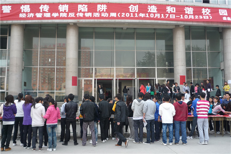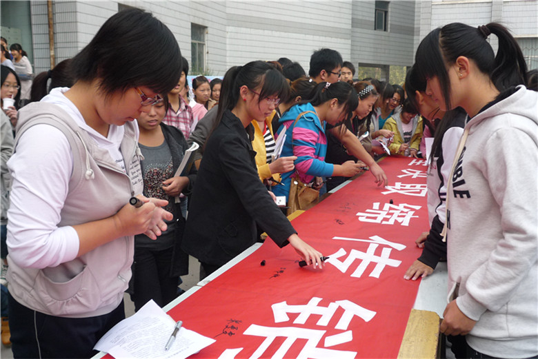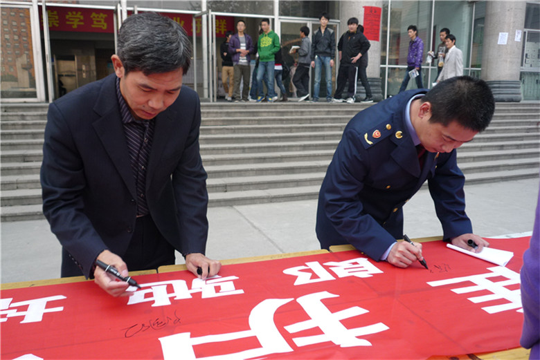 10月21日上午9点30分,bw必威西汉姆联与山阳工商分局在bw必威西汉姆联北校区主教楼前联合举行了“反传销进校园”大型签名活动,近500名经管员工在反传销的宣传横幅上郑重签下了自己的名字。山阳区工商分局科长许强、熊老师作为嘉宾莅临现场,bw必威西汉姆联经理卢国红、副经理赵春青、团总支书记孙占权、学工办负责人张永恒、顶岗实习办负责人王晶、各年级辅导员出席了此次活动。