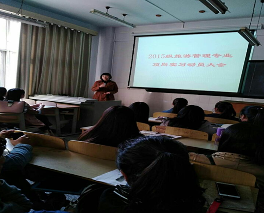 2017年10月31日,15级旅游管理专业员工顶岗实习动员大会在北校区1406教室拉开帷幕。旅游与酒店管理教研室主任卢静,顶岗实习校内指导教师安小红等参与了此次大会。大会期间,卢静老师首先就员工顶岗实习的意义、目的进行了深入浅出的阐述,加深了员工对顶岗实习重要性的认识,增强了员工的职业认知度和使命感;其次对员工顶岗实习的内容进行了具体安排,讲明了实习管理办法,言明了实习纪律,强化了员工的服从意识和责任感;最后向员工反复强调安全问题,要求员工增强安全意识,实习期间确保人身财务安全,平安顺利地完成顶岗实习。大会结束前,各位实习指导教师就员工关心和疑惑的问题回答了员工的提问,大会取得了圆满成功。