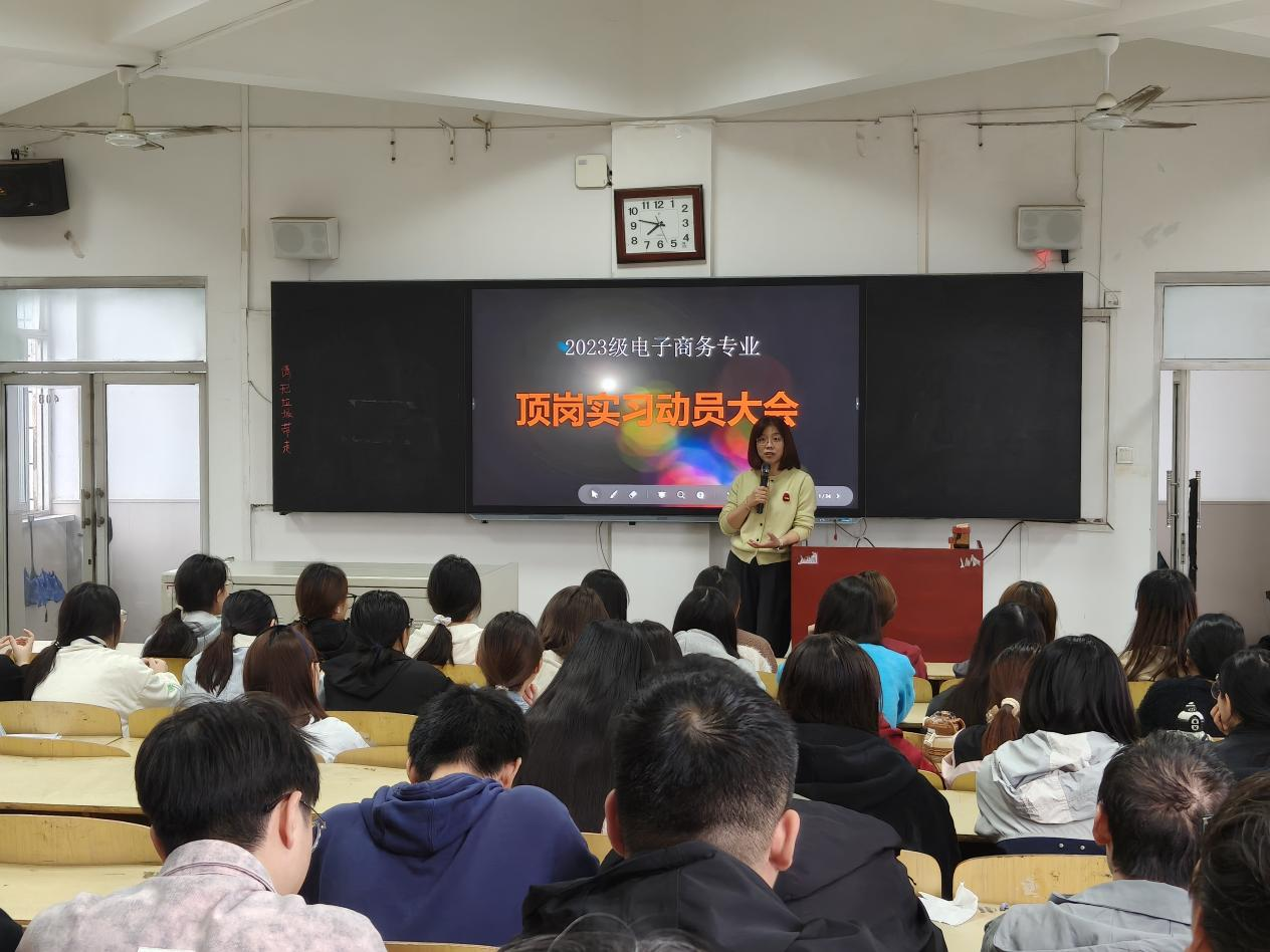 辅导员彭彬老师开场中强调,岗位实习是专业学习的“最后一公里”,更是从校园到职场的“关键转折点”。他介绍了本次动员会的核心议程与召开意义,明确岗位实习作为高职电商人才培养的核心环节,是检验课程学习成效的重要载体。并对同学们提出“珍惜实践机遇、严守纪律规范、主动求知成长”的期望,为动员会奠定务实奋进的基调。