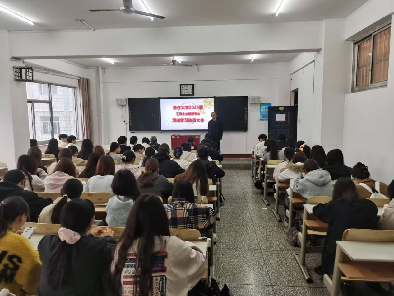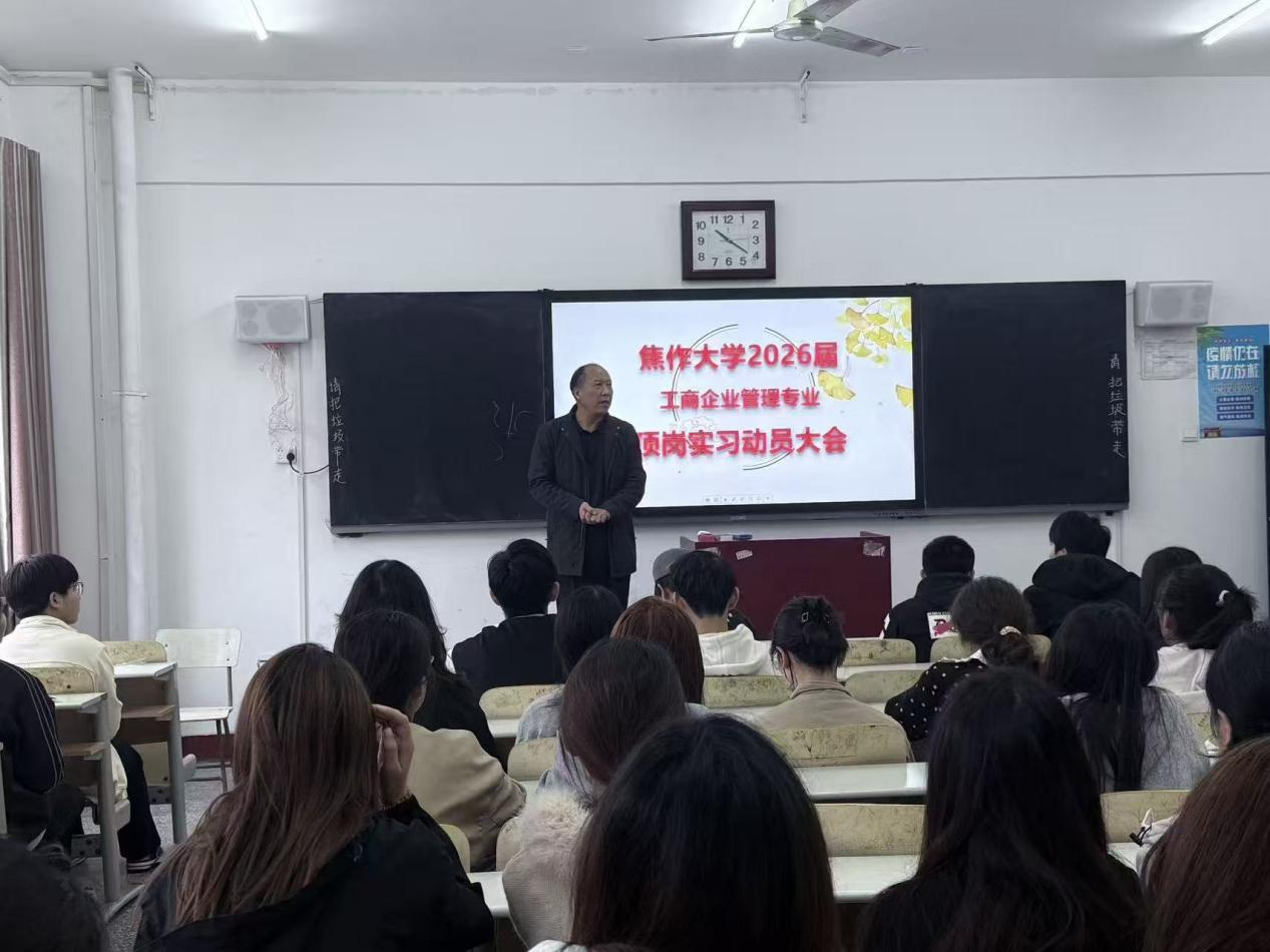 2025年10月17日上午,bw必威西汉姆联2026届工商企业管理专业毕业生在1号教学楼303教室(北校区)隆重举行了岗位实习动员大会。此次大会旨在为即将踏上实习征程的学子们统一思想、明确目标和鼓舞士气,这不仅是实习前的必要程序,还是深刻的人生导航课和职业教育课,更是同学们从校园走向社会的关键转折点。公司副经理李有良、学院实训中心主任刘倩斐、工商企业管理教研室主任刘坤、毕业班辅导员彭彬以及2026届工商企业管理专业毕业生参会。