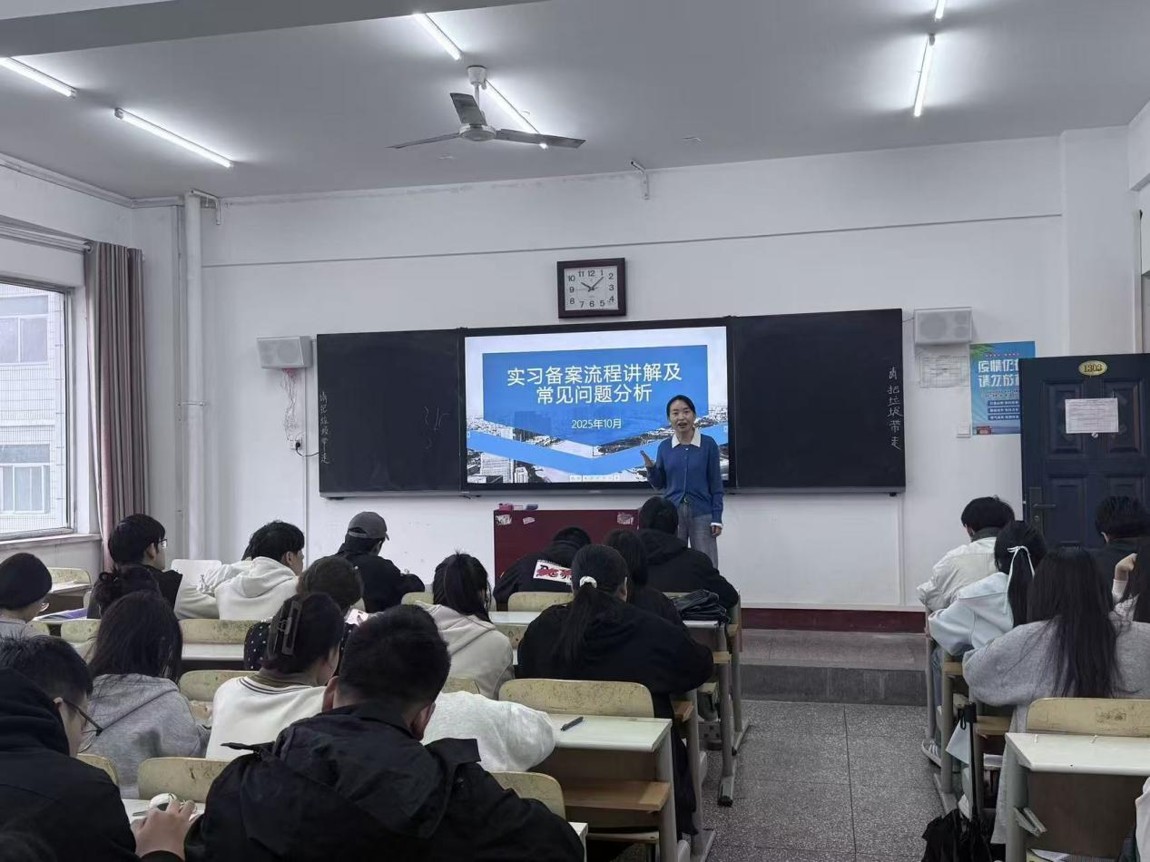 其次,学院实训中心主任刘倩斐详细介绍了河南省职业院校实习备案平台的具体操作和岗位材料收集的具体要求。认真细致的展示了实习备案平台的各项功能,具体说明了材料收集的常见问题和注意事项,使得同学们对实习备案流程认识更加清晰,为即将到来的实习工作奠定了坚实的基础。
