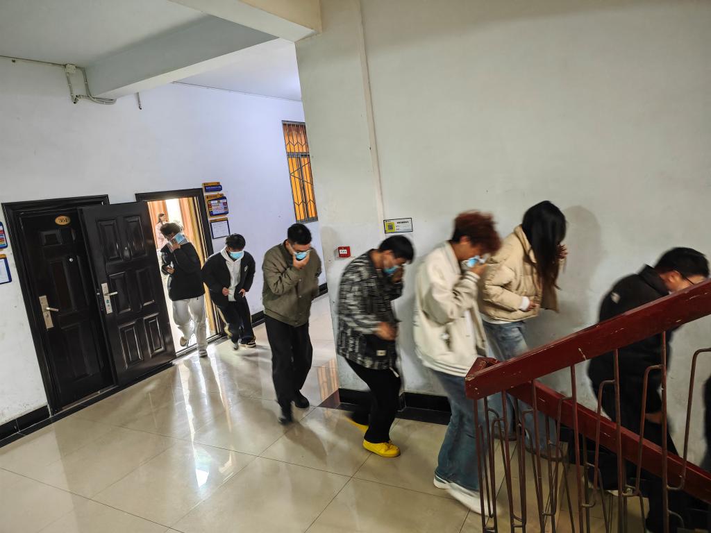 演练现场,随着哨声的响起,员工们迅速反应,按照预先制定的疏散路线,在辅导员和员工志愿者的引导下,员工用口罩捂住口鼻,弯腰低姿,按照预定疏散路线快速、有序地撤离至室外安全集结点。随后辅导员负责现场秩序维护,阻止无关人员进入模拟火场,配合消防部门实施灭火。整个疏散环节紧张有序,无人员“受伤”或遗漏。集结完毕后,学院安全专员刘倩斐对疏散情况进行点评,肯定了员工在演练中的快速反应和规范操作,同时指出疏散过程中存在的细节问题并提出改进建议。