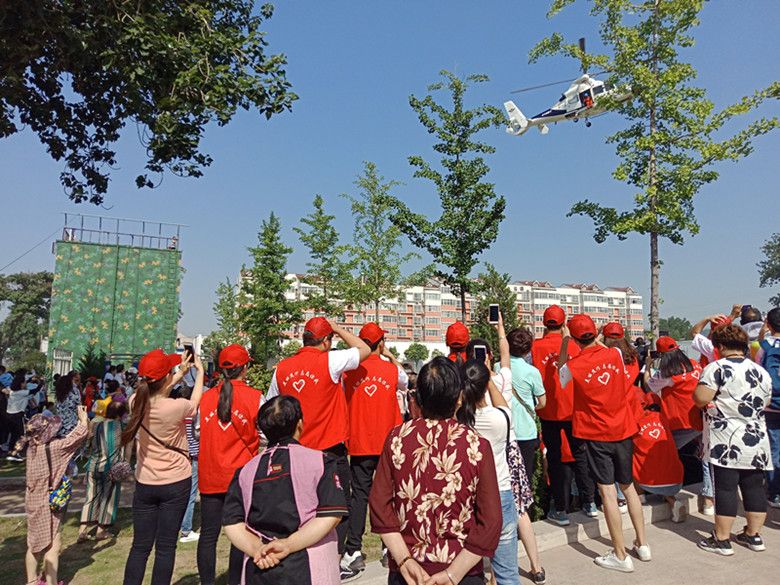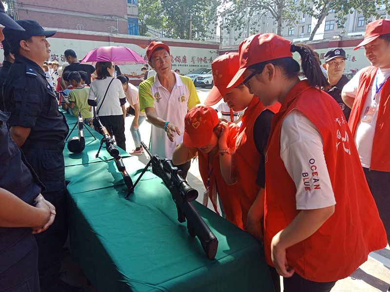 志愿者们排着队观看桌子上的警用装备,一排排整齐摆放的枪支、防弹头盔、防弹背心等等。志愿者们对琳琅满目的装备很好奇,向特警队员接连不断提问问题。志愿者们还亲自体验了装备,特警队员很耐心的教他们拿枪的姿势,如何瞄准角度锁定目标。体验过后还与警用装备合影。随后在训练场上,特警队员演示直升飞机救助伤员的情景。他们的动作娴熟,在成功救走伤员后,引起参观人员鼓掌赞赏。之后,志愿者们又观看了多名特警队员展示的近身搏击技巧等。
