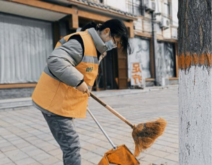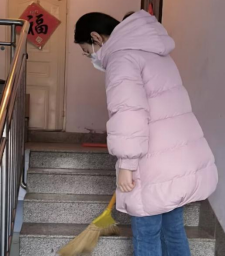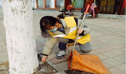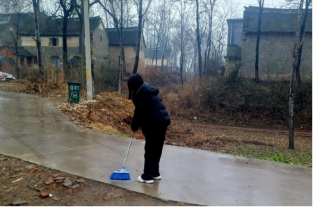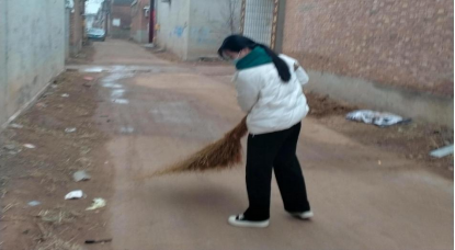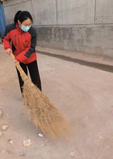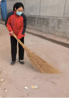 李艺玲在家乡河北省保定市唐县长古城乡田家庄村,响应村委会的号召,自备劳动工具,在马路上打扫卫生。用切实的行动,护佑家乡的绿色生态环境,展示所坚守的卫生生态理念。