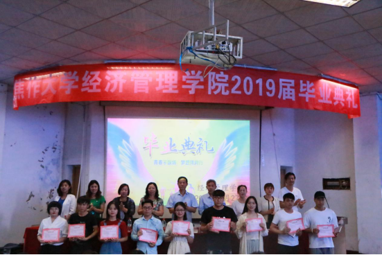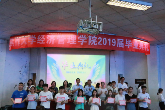 毕业典礼在雄壮的国歌声中拉开序幕。首先,副经理赵春青宣读了优秀毕业生表彰决定和优秀毕业生、优秀实习生名单。领导和老师们为优秀毕业生颁奖并和优秀毕业生并合影留念。随后,优秀毕业生代表李鑫发言,总结三年来所学知识,深切表达对学院领导、老师的感激之情和对同学、朋友的不舍之情,以及即将踏入社会的坚定信心。然后,在离别之际,经理卢国红做总结发言,对全体毕业生顺利完成学业、即将踏上崭新征途表示衷心的祝贺,并深情寄语,母校永远是同学们的坚强后盾和心灵家园,祝全体毕业生前程似锦,平安幸福。最后,全体同学一起观看2019届《我的大学》电子相册,副经理李玉琪致词,愿毕业生放飞梦想的翅膀,扬帆远航!