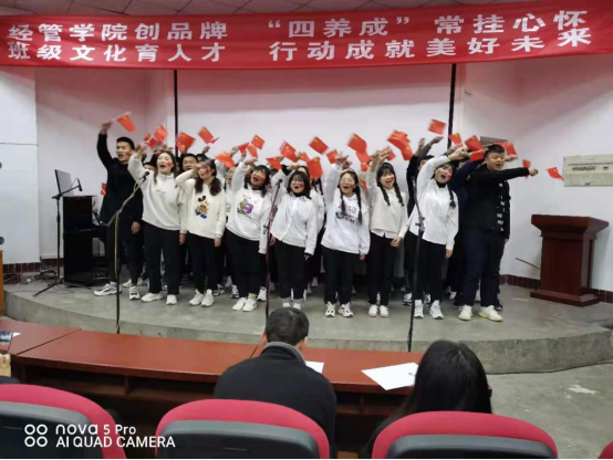 接下来是营销三班的班歌《我相信》,声音洪亮而富有激情。从精心编排的站位,到振奋人心的合唱,再到最后的口号:乘风破浪,气宇轩昂,三班有我,共创辉煌!都让我们感受到三班班训“团结、自强、勤学、善思”的魅力所在。