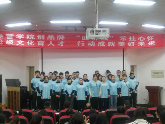 最后是营销四班的串烧《追梦赤子心》,由文艺委员的个人独唱再到全班合唱,热情的脸上都洋溢着对美好梦想的向往,展现出四班班训“团结、友爱、勤学、自强”的气势所在。